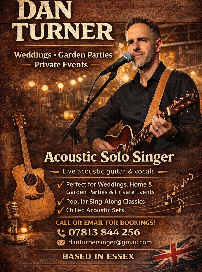 With 20 years of experience in the music industry, Dan Turner is an acoustic guitar solo singer based in Essex, UK. Specializing in weddings, and private functions, Dan's performances create a unique atmosphere for any event. Offering a blend of laid-back tunes and upbeat melodies, Dan ensures an engaging experience tailored to your needs.